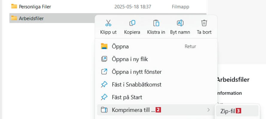 I menyn ska du välja Komprimera till… 2 och sedan Zip-fil 3. Om du använder Windows 10 väljer du alternativet Skicka till i högerklicksmenyn och väljer Komprimerad mapp.