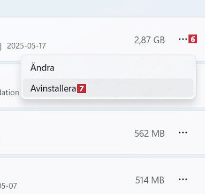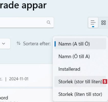 Till höger ska du välja att sortera efter Storlek (stor till liten) 5 för att se de största programmen längst upp i listan.