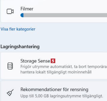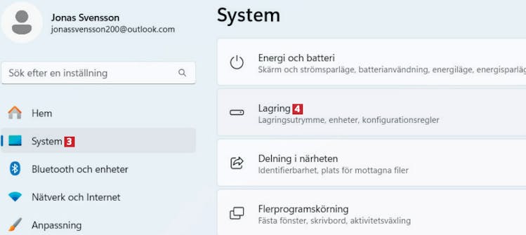 Klicka på System 3 följt av Lagring 4 i menyn till vänster (Windows 10) eller i mitten (Windows 11).
