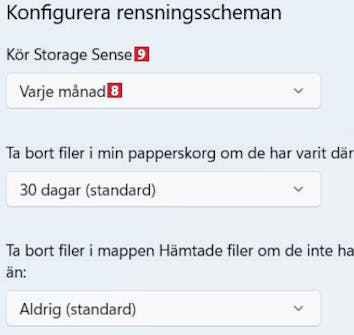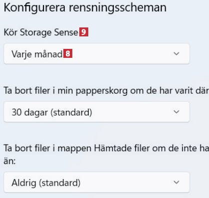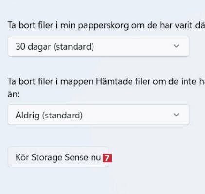 Klicka på knappen Kör storage Sense nu 7 långt ner på sidan. Nu startar verktyget och rensar bort filer på datorn.