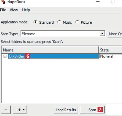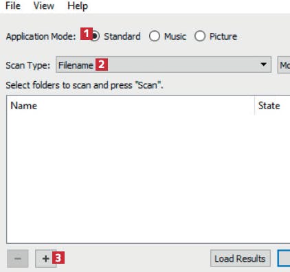 Hämta och installera DupeGuru från vår hemsida. Öppna det och välj Standard 1 och Filename 2. Klicka på plustecknet 3.