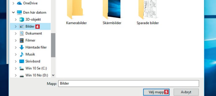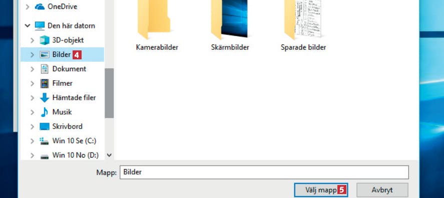 Välj vilken mapp du vill undersöka 4 följt av Välj mapp 5. Du kan naturligtvis också skanna flera mappar. Det gör du genom att hålla ned Ctrl-tangenten och sedan markera de mappar som ska skannas.
