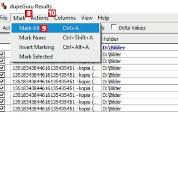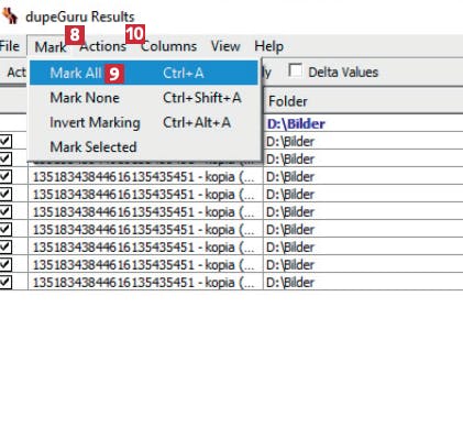 Nu visas alla dubbletter i de mappar du valde att undersöka. Klicka på Mark 8 och Mark All 9. Välj Actions 10 följt av Send Marked to Recycle Bin.