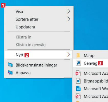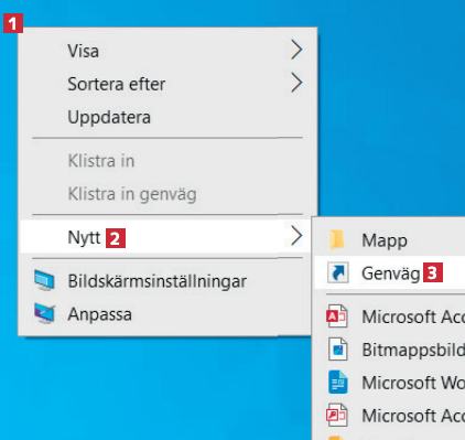 För att skapa en genväg till en hemsida ska du först högerklicka på skrivbordet 1 och föra muspekaren till alternativet Nytt 2. Där klickar du på Genväg 3.