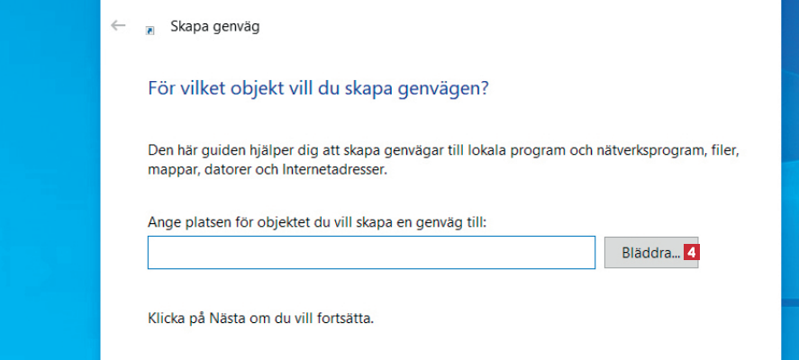 En liten guide startar. Klicka på Bläddra… 4 för att välja det program du vill skapa en genväg till.