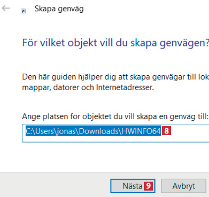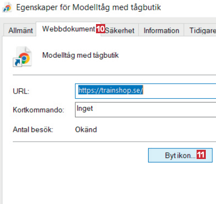 Nu är din nya genväg klar. Den har fått din standardwebbläsares ikon, men det kan du enkelt ändra: Högerklicka på den nya genvägen 8 och välj Egenskaper 9.