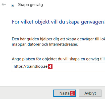En liten guide startar. Skriv in adressen till hemsidan 4 som genvägen ska öppna. Klicka på Nästa 5.