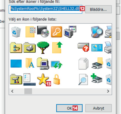 Skriv in %SystemRoot%\ System32\SHELL32.dll i adressfältet 12 och tryck Retur. Välj en passande ikon 13, klicka på OK 14 och sedan på OK igen.