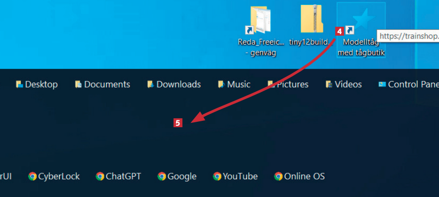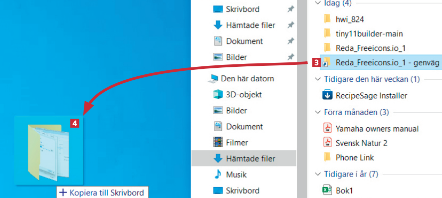 Genvägen visas nu med en liten pil i ikonen. Dra nu ut genvägen 3 från Utforskaren och släpp den på skrivbordet 4.