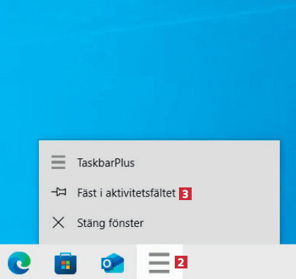 Nu dyker TaskbarPlus upp i aktivitetsfältet. Högerklicka på ikonen 2 och välj Fäst i aktivitetsfältet 3. Klicka på ikonen 2.