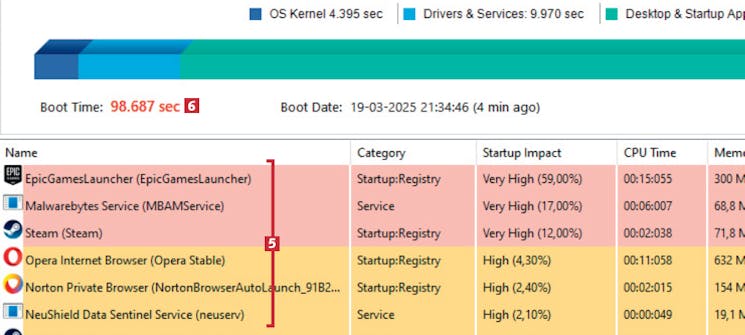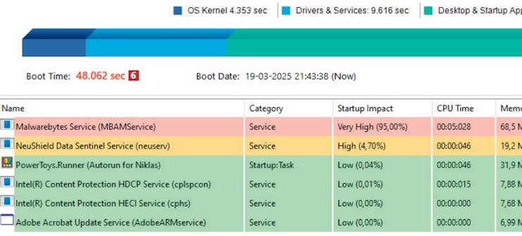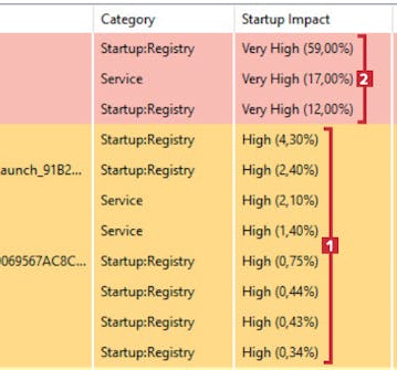 Börja med att titta på mätningen du gjorde tidigare. Leta särskilt efter High 1 och Very High 2 i översikten. Det är de programmen som gör att datorn startar långsamt.