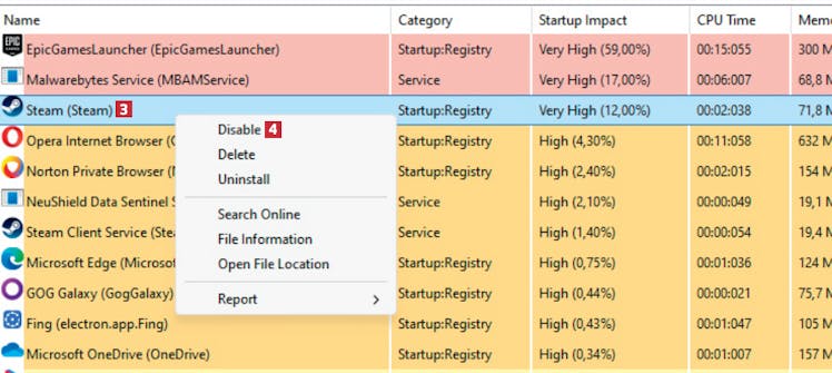 För att förhindra att ett program startar automatiskt högerklickar du på det 3 och väljer Disable 4. Nu kommer det inte längre att starta tillsammans med Windows.