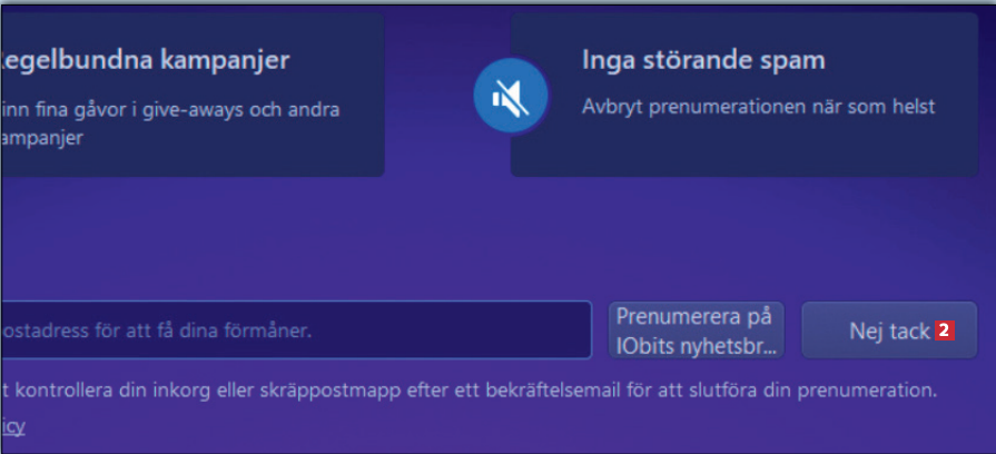 I nästa fönster väljer du Nej tack 2 i det nedre högra hörnet. Det kan också hända att din webbläsare öppnar ett fönster med ett erbjudande, men det ska du ignorera.