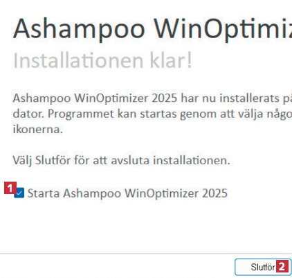 Hämta WinOptimizer 2025 från vår hemsida och installera det. I slutet av installationen ska du låta Starta Ashampoo… 1 vara markerat och klicka på Slutför 2.