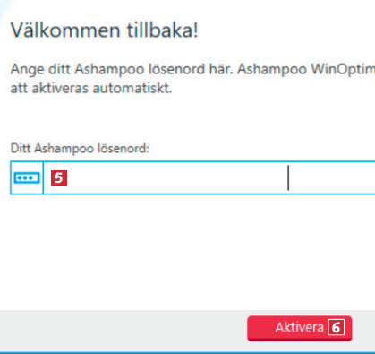 Om du redan har ett konto hos Ashampoo, fyll i ditt lösenord 5 och klickar på Aktivera 6. Om du inte har något konto kommer du att få ett mejl som hjälper dig att skapa ett.