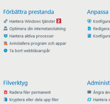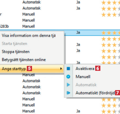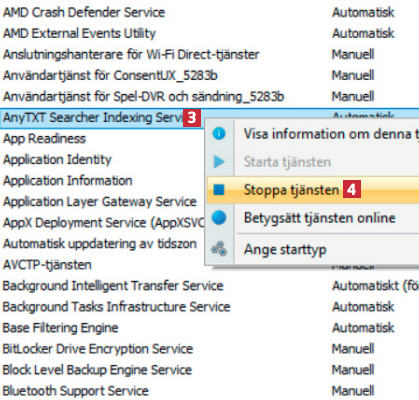Här visas allt som startar med Windows. Högerklicka på ett program som du själv har installerat 3 och välj Stoppa tjänsten 4 för att frigöra datorkraft.