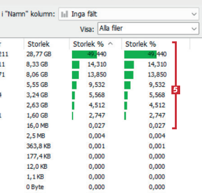 Hårddisken genomsöks och du får nu en översikt över de största filerna och mapparna 5. Du kan klicka dig in i mapparna för att se vad som tar upp mest utrymme.