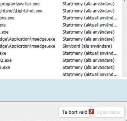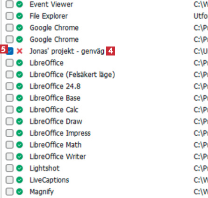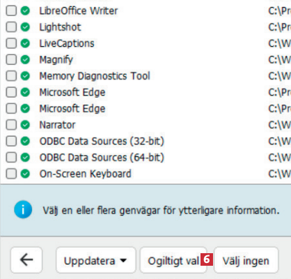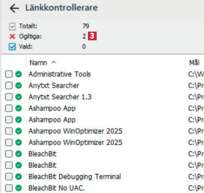 När du bläddrar ner i översikten kan du se mer information om de genvägar som inte längre fungerar 4. De genvägar du vill ta bort markerar du med en bock 5.