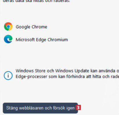 Om någon av dina installerade webbläsare är öppen, klicka på knappen Stäng webbläsaren och försök igen 3, så att de filerna kan tas med i städningen