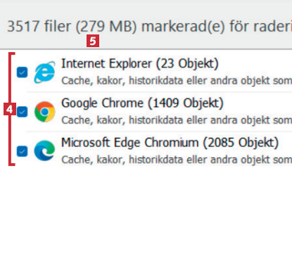 Nu ser du resultatet för var och en av dina webbläsare 4. Här kan du också se hur mycket utrymme du kan frigöra på hårddisken när du rensar upp bland dina filer 5.