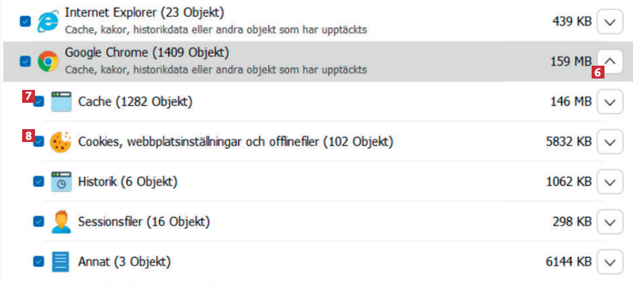 Bredvid varje webbläsare kan du expandera menyn på höger sida 6, och om du inte vill radera dina cookies 7 eller din historik 8 kan du avmarkera var och en av dem.