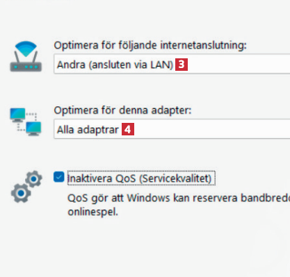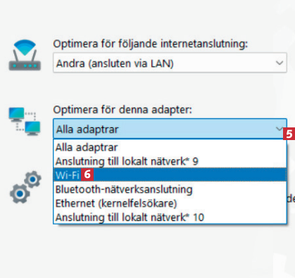 Välj sedan den anslutning som du vill optimera 3, samt vilken eller vilka adaptrar 4 du vill optimera.