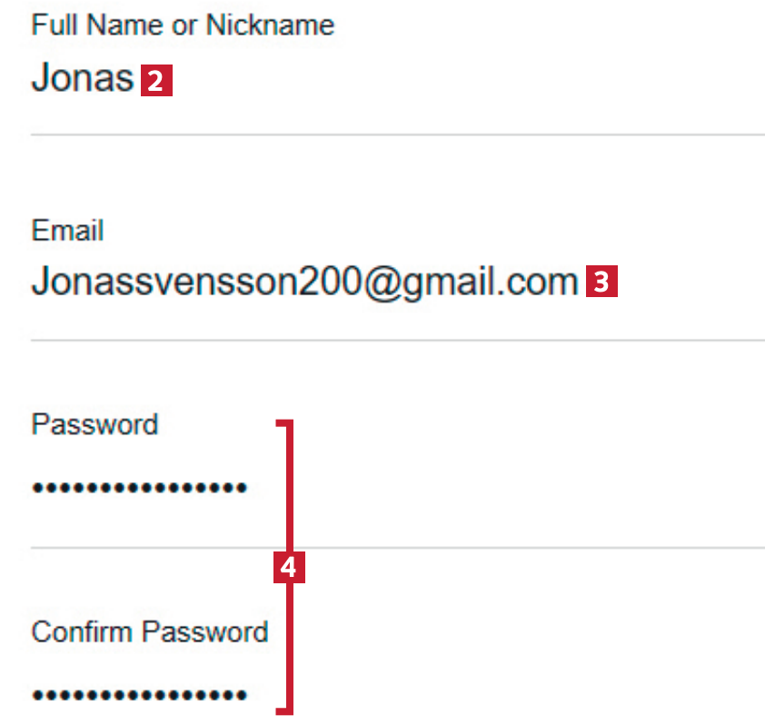 Skriv in namn 2, mejl 3, och lägg till ett lösenord 4. Kontot måste skapas för att få serverutrymme för dina recept.