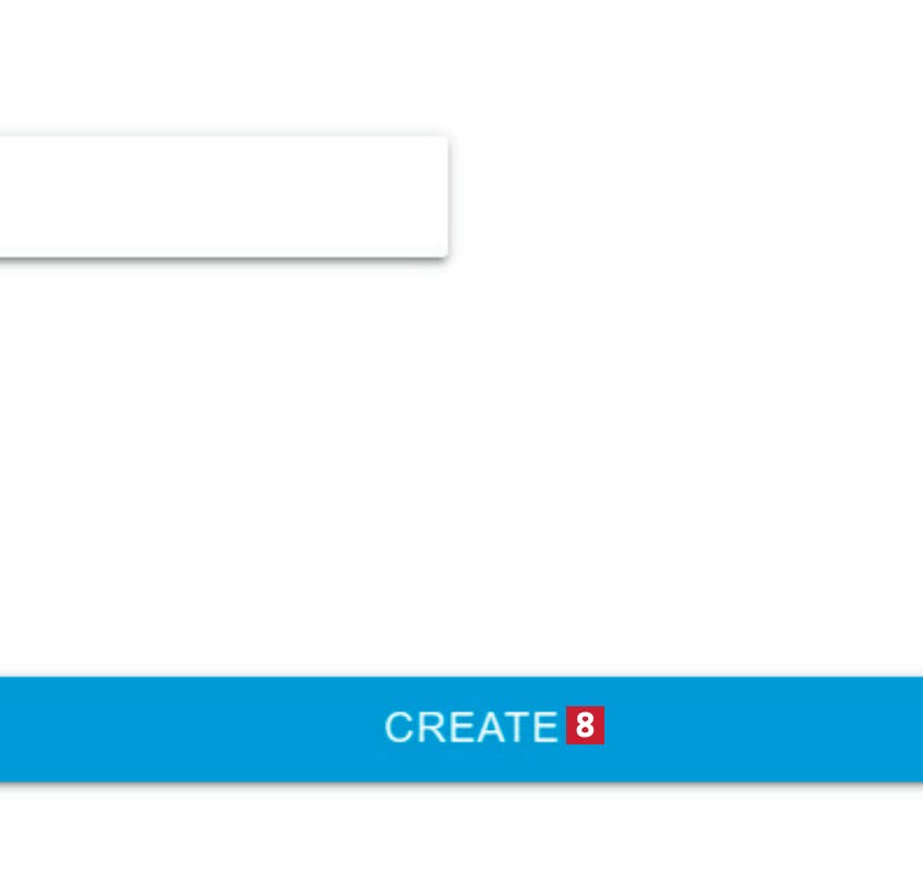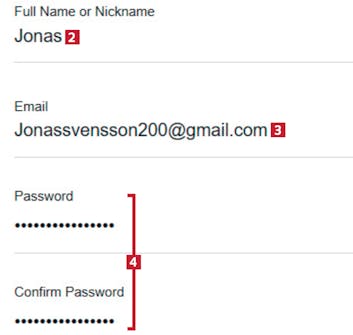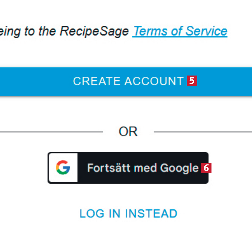 När du har fyllt i informationen och valt ett lösenord klickar du på knappen CREATE ACCOUNT 5. Observera att du kan registrera dig via ditt Google-konto 6 om du vill det.