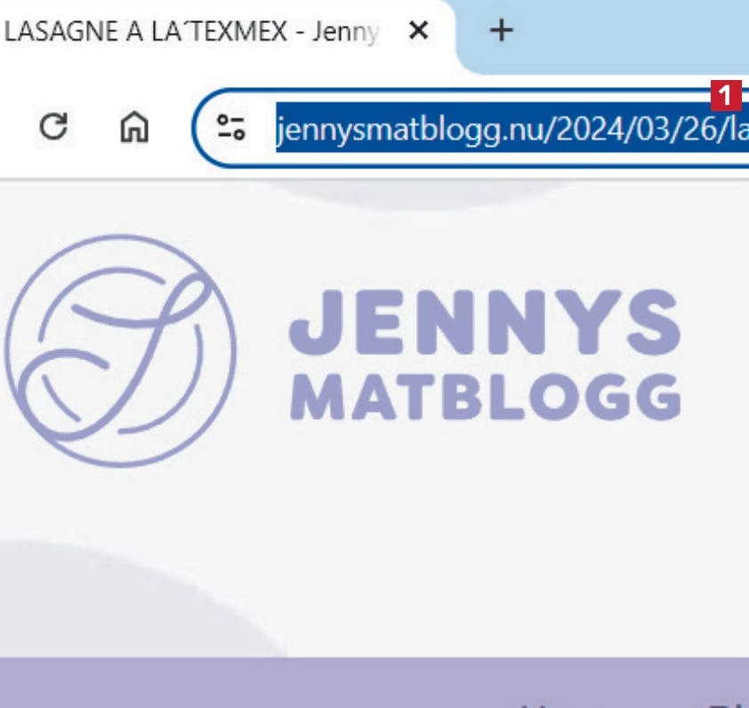 Öppna först webbplatsen med det recept som du vill spara. Markera adressen 1 och tryck på Ctrl + C på tangentbordet för att kopiera adressen till receptet.