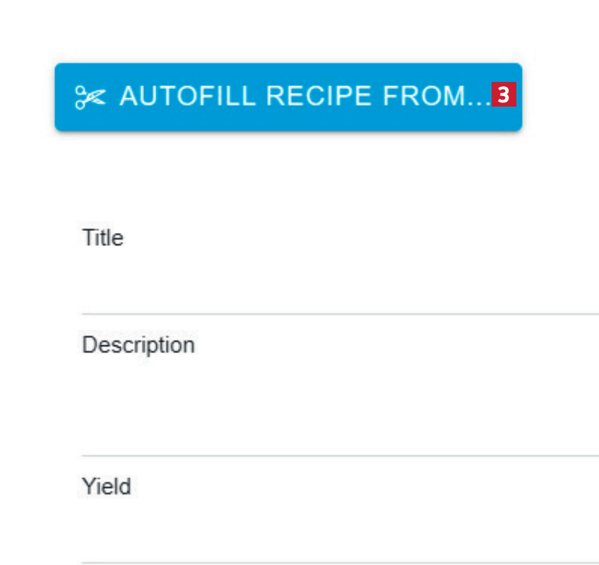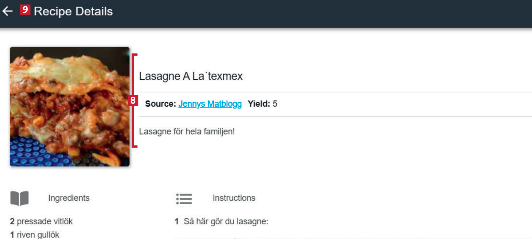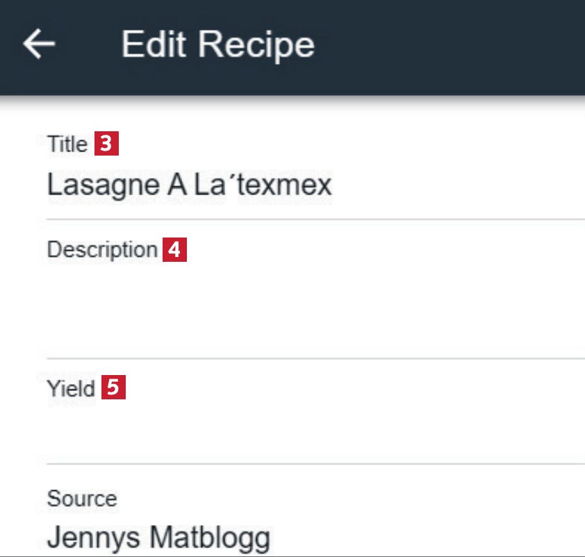 Under Title 3 kan receptet få ett nytt namn. I Description 4 ändrar du beskrivningen, och under Yield 5 skriver du antalet portioner receptet lämpar sig för.
