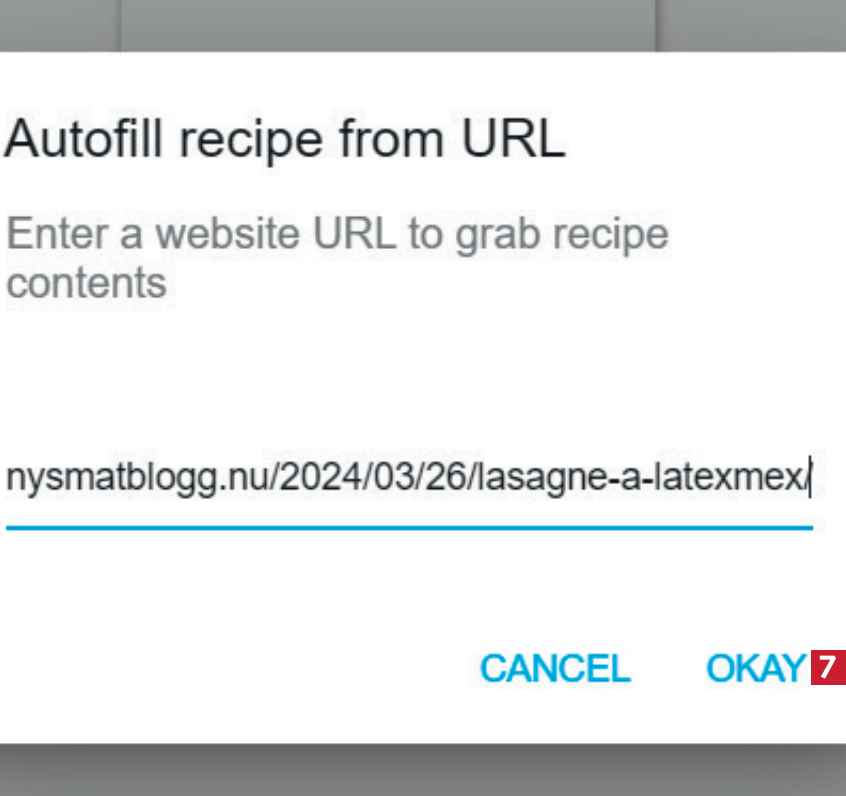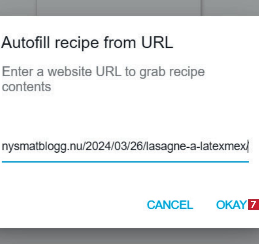 Länken till webbplatsen läggs till. Klicka på OKAY 7. Programmet tar sedan en stund på sig att importera receptet från webben.