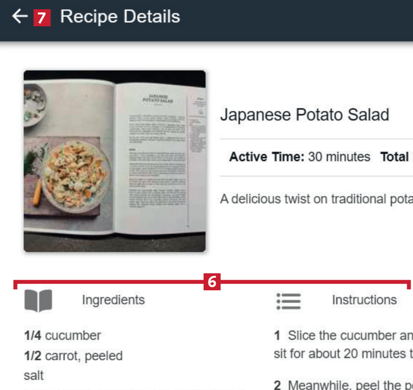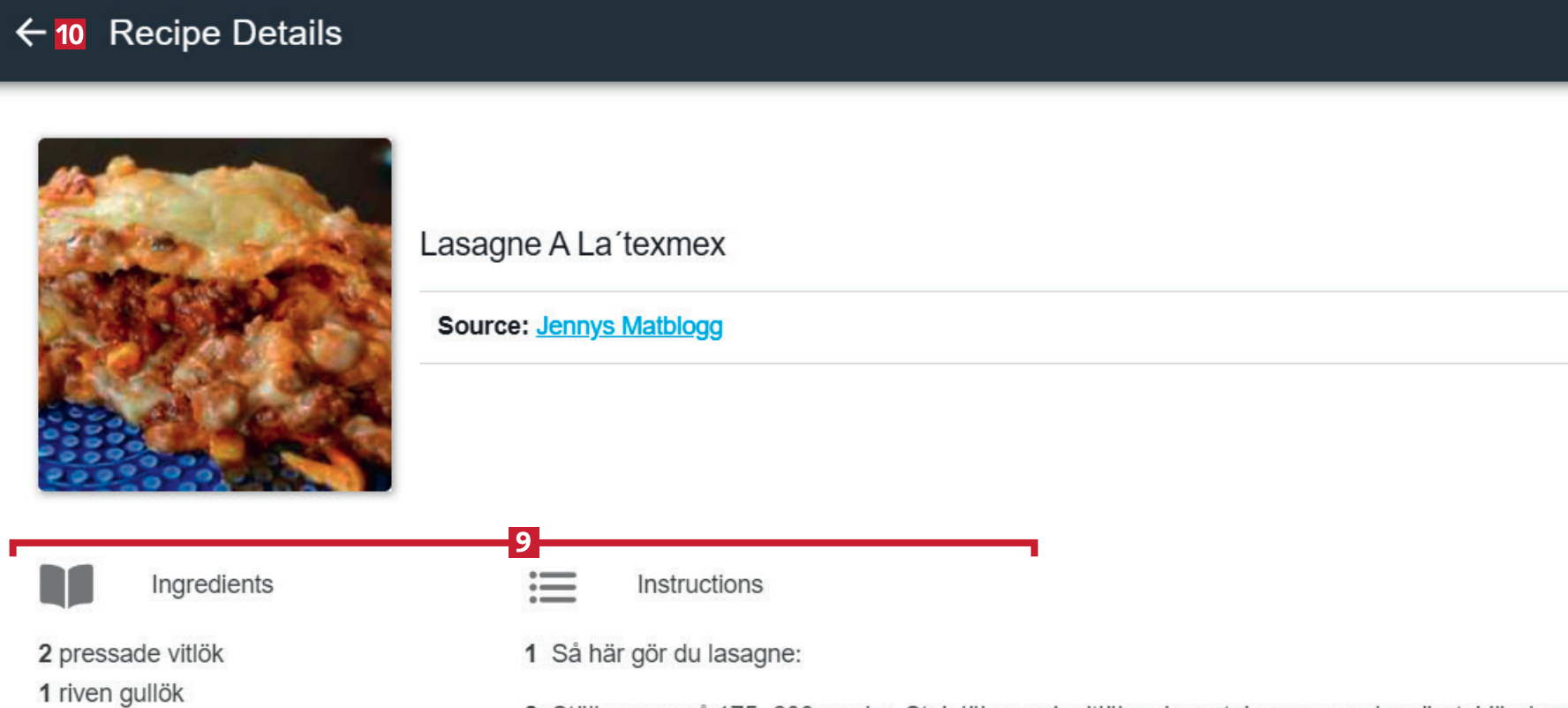 Du har lagt till receptet till din samling. Den innehåller både ingrediensförteckningen och stegen 9 från webbplatsen. Klicka på pilen i vänstra hörnet 10 för att komma tillbaka till programmets huvudmeny.