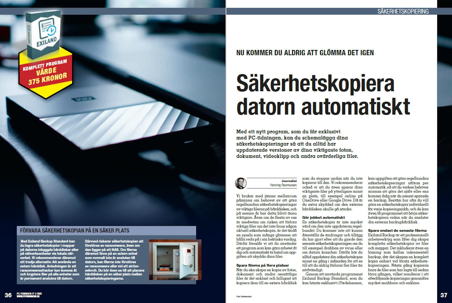 Genom att använda programmet Exiland Backup Standard, som du kan hämta exklusivt i Fördelszonen, kan uppgiften att göra regelbundna säkerhetskopieringar utföras per automatik, så att du varken behöver minnas att göra det själv eller ens komma ihåg när du senast sparade en backup. Bestäm hur ofta du vill göra en säkerhetskopia individuellt för varje kopieringsjobb, och du kan även få programmet att börja säkerhetskopiera redan när du ansluter din externa backuphårddisk.