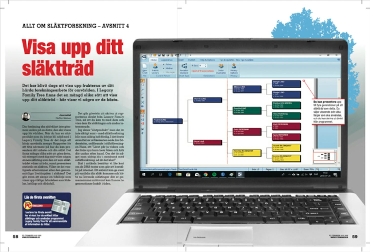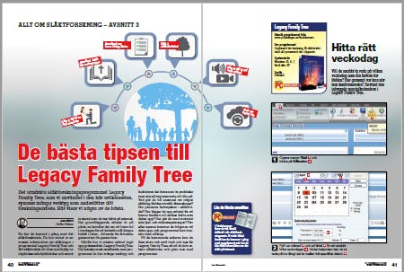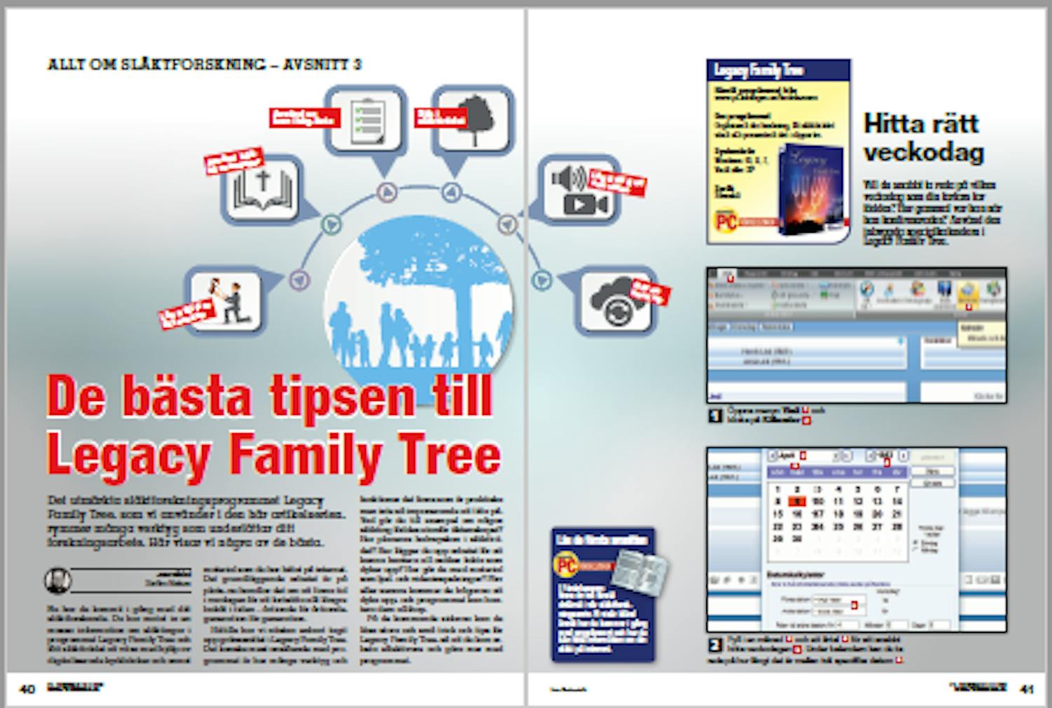Legacy Family Tree är ett omfattande släktforskningsprogram. Det är översatt till svenska och innehåller allt som behövs för seriösa släktforskare. Det hjälper till att leta upp information om släkten på några av de stora webbsidorna i ämnet - FindMyPast, FamilySearch, GenealogyBank och MyHeritage. Det går att dela historien om din släkt med andra, se och anteckna dödsorsaker och vi vissa fall till och med hitta bilder av släktingarnas gravstenar. Programmet kan även användas för att spela släktbingo, som kan bli uppskattat på nästa släktträff.