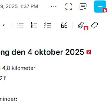 Klicka på +-ikonen 6 för att skapa en ny sida i dagboken. Programmet skapar automatiskt den första raden som rubrik 7. Klicka på gemet 8 för att infoga en bild.