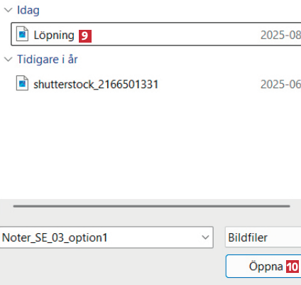 Markera din bild 9 och klicka på Öppna 10. Då kommer bilden att infogas i din text. Bilden kommer att ta upp hela bredden på textfältet.