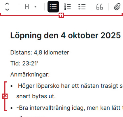 Du kan använda verktygsfältet 11 längst upp för att formatera din text. Här har vi skapat en punktlista 12 för att göra texten mer överskådlig.