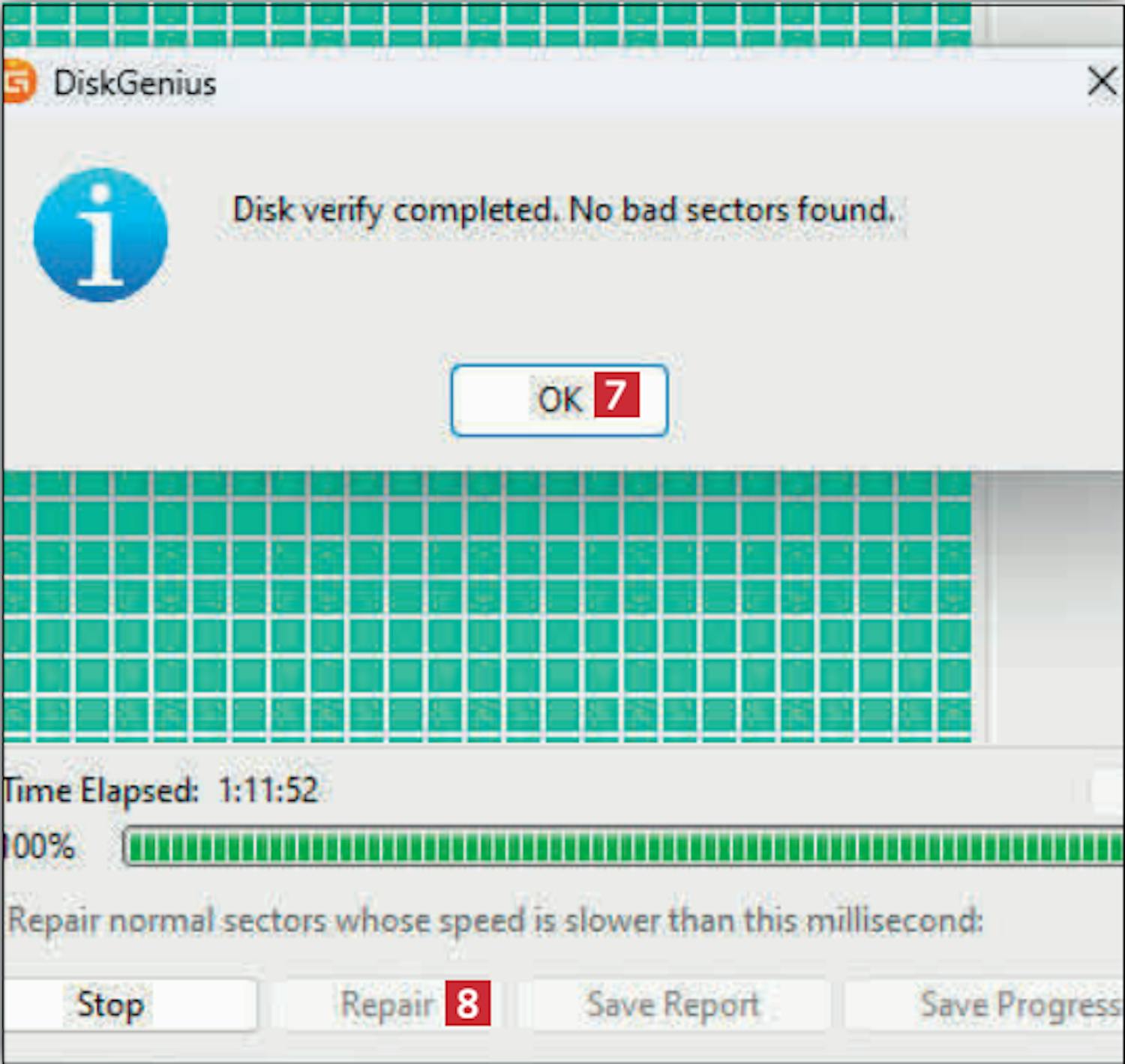En mekanisk hårddisk kan drabbas av fel på de sektorer som innehåller din information, precis som cellerna på en SSD kan gå sönder efter många skrivningar. DiskGenius kan hitta felen och isolera de trasiga områdena.