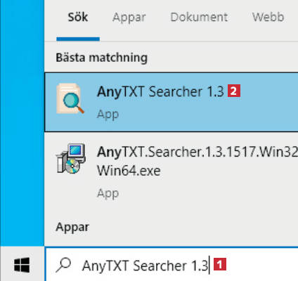 Öppna programmet genom att söka efter anytxt 1 och klicka på sökresultatet 2. Du kan också öppna programmet med kortkommandot Alt + Q.