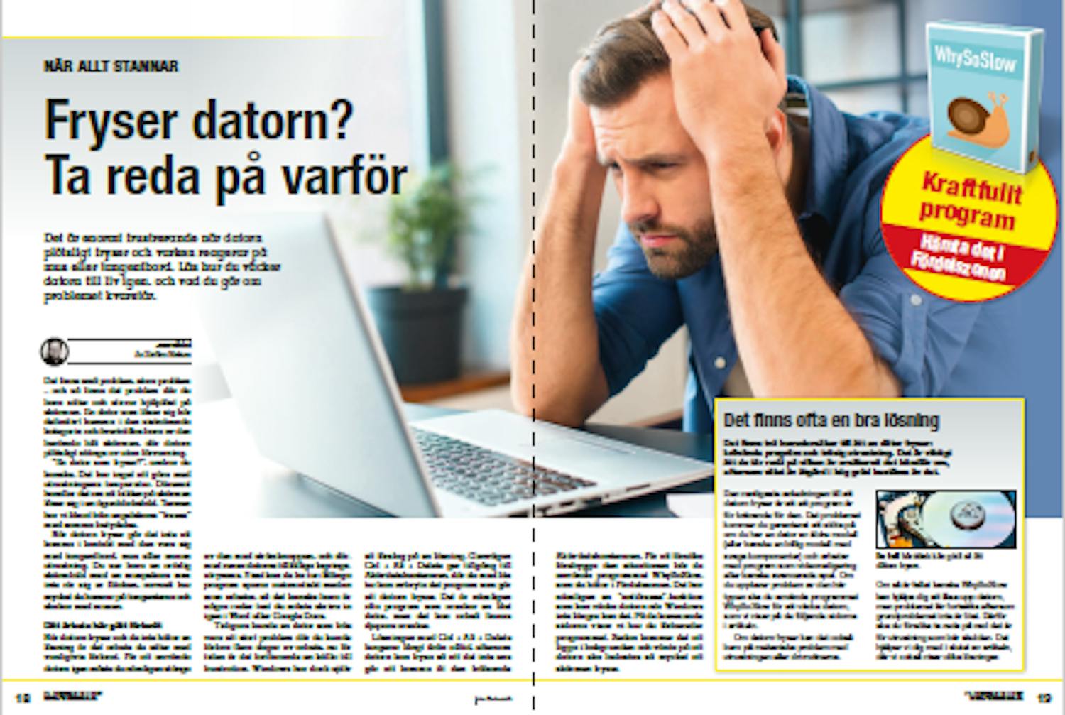 Tidigare kunde en dator som frös vara ett stort problem där du kunde förlora flera dagar av arbete, nu för tiden är det fortfarande en källa till frustration. Windows har dock själv ett förslag på en lösning. Genvägen Ctrl + Alt + Delete ger tillgång till Aktivitetshanteraren, där du med lite tur kan avbryta det program som gör att datorn fryser. Det är nämligen ofta program som orsakar en låst dator, men det kan också finnas djupare orsaker. Lösningen med Ctrl + Alt + Delete fungerar långt ifrån alltid, eftersom datorn kan frysa så att det inte ens går att komma åt den frälsande Aktivitetshanteraren. För att försöka förebygga den situationen bör du använda programmet WhySoSlow, som du hittar i Fördelszonen.