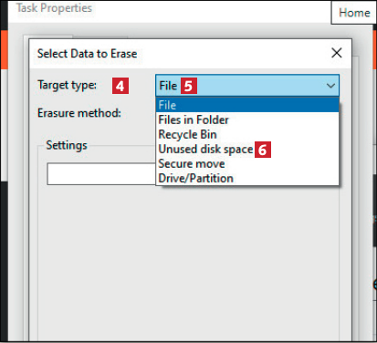 Vid Target type 4 väljer du File 5 följt av Unused disk space 6 .
