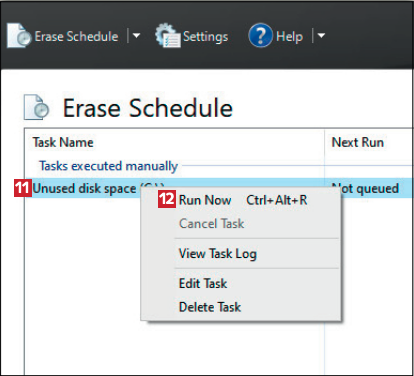 Högerklicka på alternativet Unused disk space 11 och välj Run Now 12. Då startar raderingen, som kan ta flera timmar.