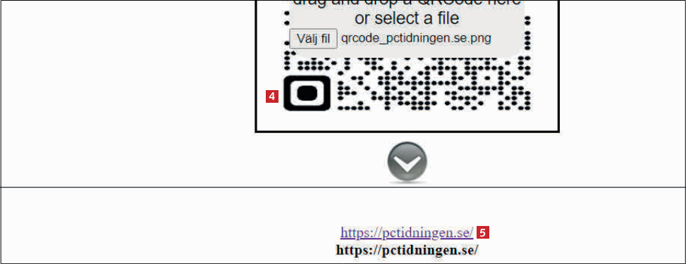 QR-koden 4 visas i Webqr. Under den visas adressen till hemsidan 5 som koden leder till. Klicka på länken för att komma till sidan.