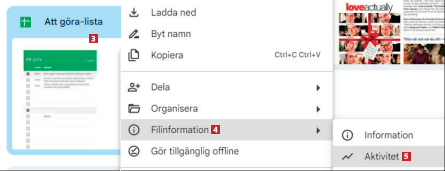 Högerklicka 3 på kalkylarket i översikten i Google Drive, håll muspekaren över Filinformation 4 och klicka på Aktivitet 5.