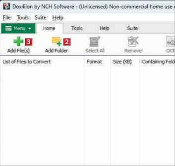 Klicka på Add Folder 2 för att lägga till en hel mapp med dokument, eller Add File(s) 3 för att lägga till en eller flera filer.