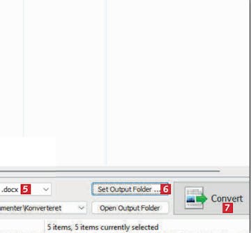 Välj formatet .docx 5 och klicka på Set Output Folder… 6 för att välja destination för filerna. Klicka på Convert 7 för att starta jobbet.