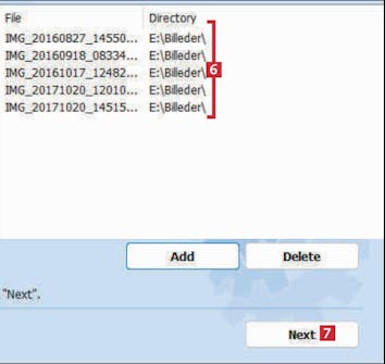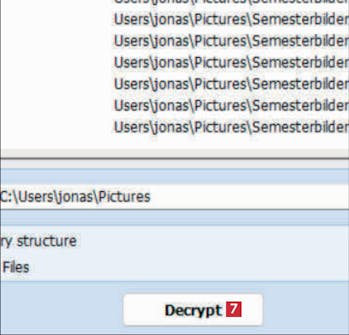 Nu visas innehållet i den krypterade filen 4. Markera filer som ska dekrypteras 5. Klicka på mappikonen 6 och välj en mapp som filerna ska packas upp till.