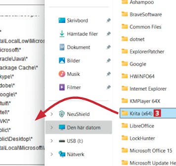 I Utforskaren letar du upp det program som du vill skapa ett undantag för. Dra applikationens mapp, till exempel Krita (x64) 3, till översikten i S.O.S Security Suite.