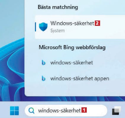 Börja med att skriva windowssäkerhet 1 i Windows sökruta. Klicka på sökresultatet som heter Windows-säkerhet 2.