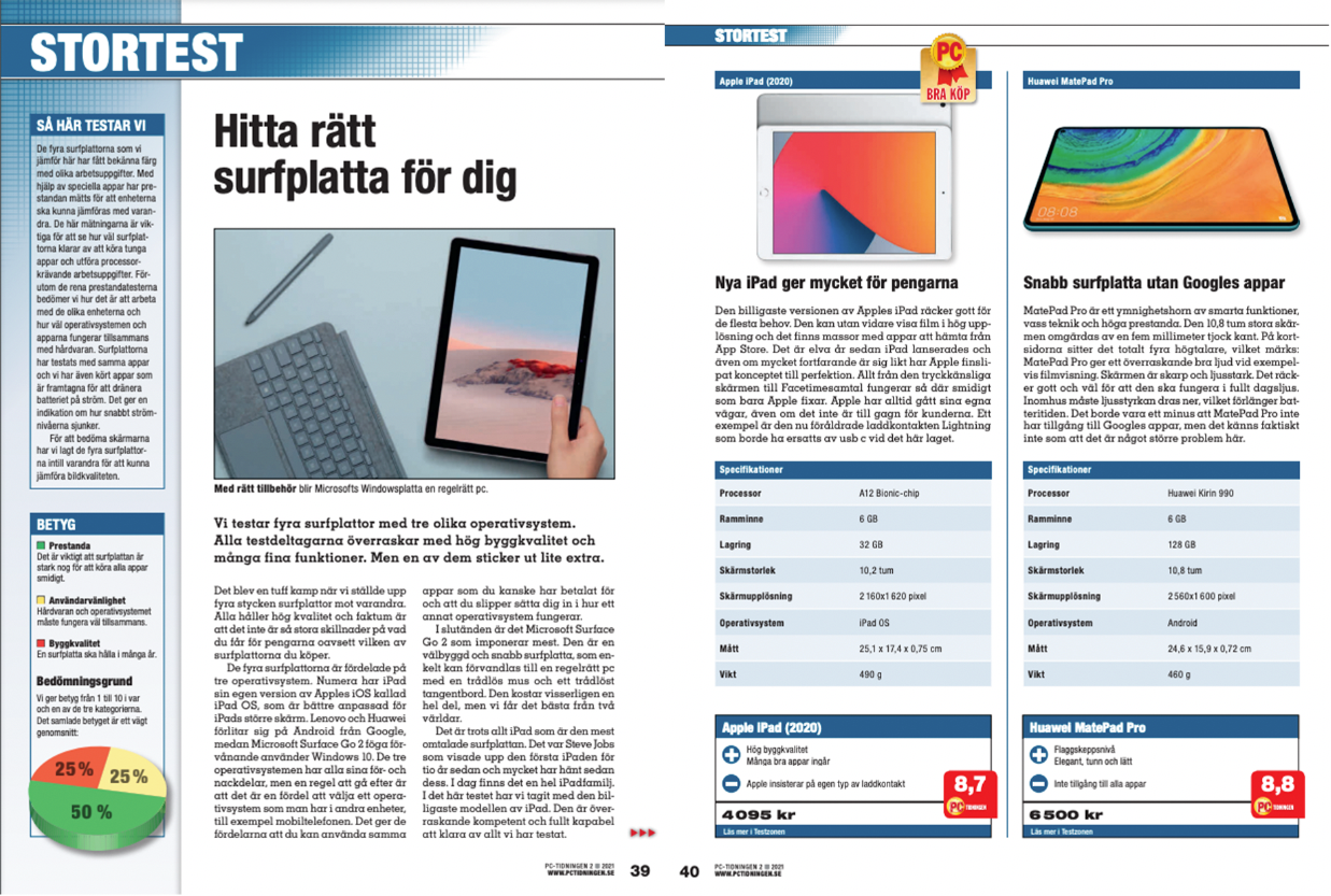 I slutänden är det Microsoft Surface Go 2 som imponerar mest. Den är en välbyggd och snabb surfplatta, som enkelt kan förvandlas till en regelrätt pc med en trådlös mus och ett trådlöst tangentbord. Den kostar visserligen en hel del, men vi får det bästa från två världar.